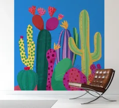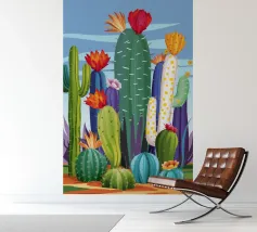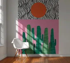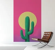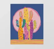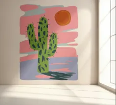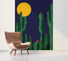 Een grillige illustratie toont kleurrijke cactussen in een pot tegen een grote cirkel met patroon die de maan of zon voorstelt, waardoor een magisch en surrealistisch nachtelijk tafereel in de woestijn ontstaat.