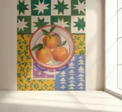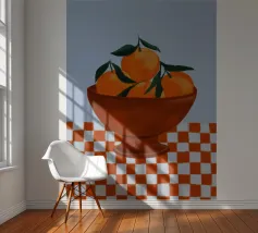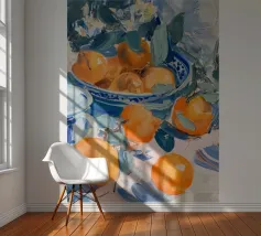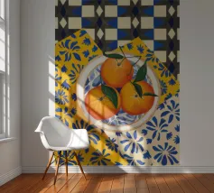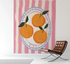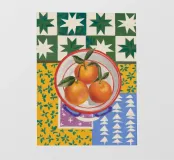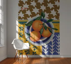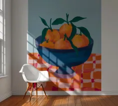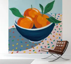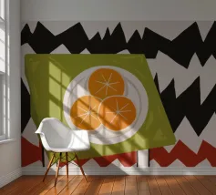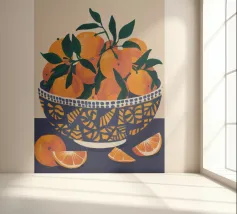 Mandarin oranges in a glass bowl atop geometric patterned cloth combine freshness and boldness.