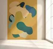 Een rustgevend abstract werk met vloeiende, vloeibare vormen in een zacht, aards palet van mosterdgeel, groen en beige, dat een gevoel van zachte beweging creëert.