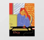 Een hedendaagse illustratie van een vrouw met levendig rood haar die achter haar computer werkt in een schemerige kamer. De gloed van het scherm verlicht haar gezicht en blauwe shirt. De scène toont een moment van focus en productiviteit op de late avond, met persoonlijke voorwerpen zoals een bril op het bureau.