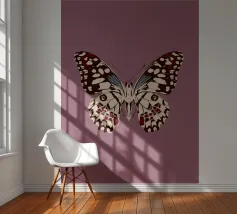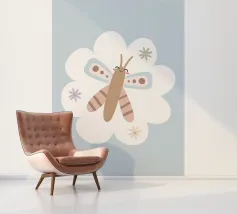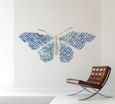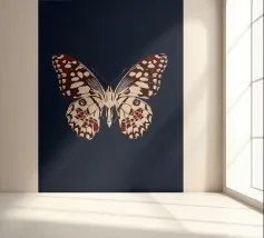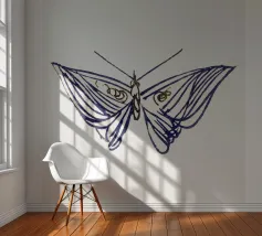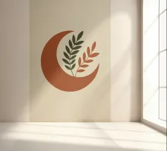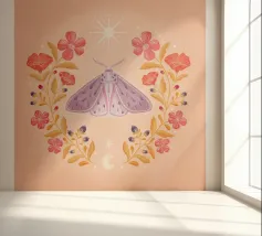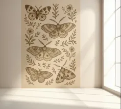 Een gestileerde afbeelding van een mot met ingewikkelde ontwerpen op de vleugels, waarin natuurlijke en hemelse motieven zijn verwerkt. De vleugels tonen delicate contouren van takken en vormen van halve maantjes tegen een gedempt kleurenpalet.