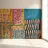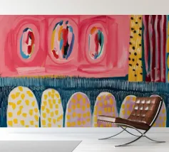 Een lappendeken van verschillende patronen, waaronder lijnen en U-vormen, in levendig geel, blauw, roze en rood, creëert een kleurrijk mozaïekeffect in dit abstracte werk.