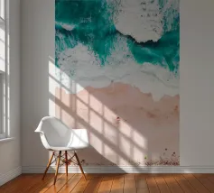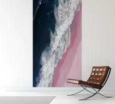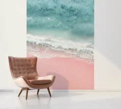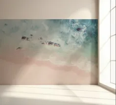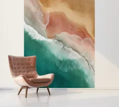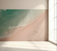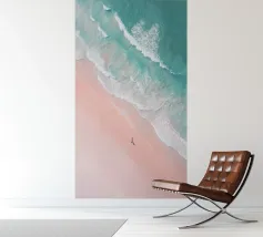 Prachtige luchtfoto van een minimaal strand en de oceaan, in zachte pastelkleuren.