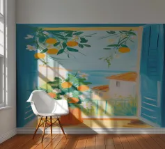 Een uitzicht door een raam op een prachtige sinaasappelboom, zwaar van rijp fruit. Het warme, zonovergoten licht en het charmante onderwerp creëren een scène van rustieke, mediterrane overvloed.