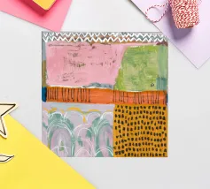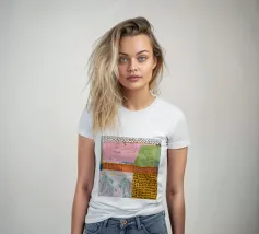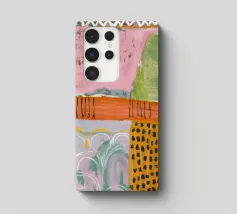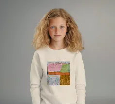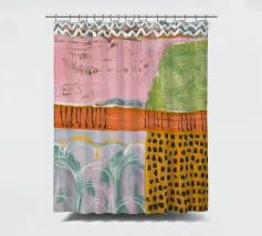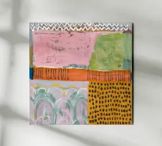 Een zachte, abstracte compositie met een lappendeken van pastelkleuren waaronder roze, lichtgroen en oranje, met gebieden van gestippelde patronen en zachte lijnen, waardoor een sereen en delicaat visueel veld ontstaat.