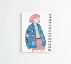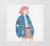 Een meisje in roze rok en blauw patch jack staat kalm en zelfverzekerd tegen een schone witte achtergrond.