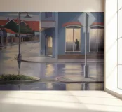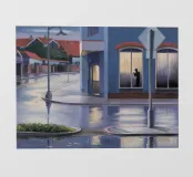 Vanuit een auto gezien, staat een eenzame figuur in een deuropening aan de overkant van een verregende straat. De scène, met zijn natte weerspiegelingen en stemmige verlichting, roept een gevoel op van melancholie, mysterie en stedelijke eenzaamheid.