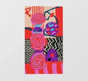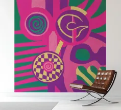 A dynamic abstract composition features bold, rhythmic shapes, spirals, and patterns in a vibrant palette of reds, pinks, blues, and black, creating an energetic and visually stimulating piece.