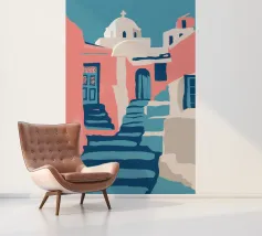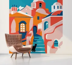 Een charmante illustratie van een zwarte kat die op de trappen van een mooie stad aan zee zit, met gebouwen in zachtroze. Het tafereel is vredig, schilderachtig en vol mediterrane charme.