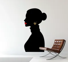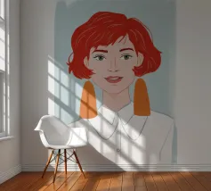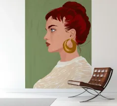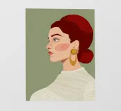 Dit zeer elegante profielportret toont een vrouw met rijk, robijnrood haar dat zorgvuldig in een knot is gestyled. Haar bedachtzame, serene blik, in combinatie met een eenvoudige gouden oorbel tegen een zachtgroene achtergrond, creëert een tijdloze uitstraling van klassieke schoonheid en verfijning.