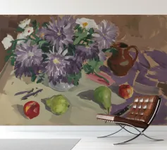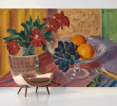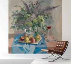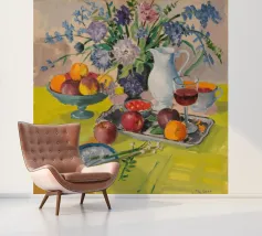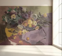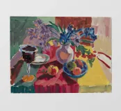 A lavish still life painting features a silver teapot, a cup of tea, a bowl of fruit including apples and berries, and a vibrant bouquet of flowers, all richly colored and textured, on a table.