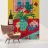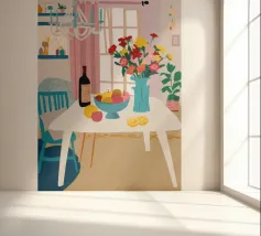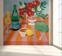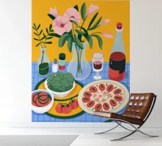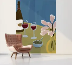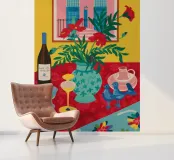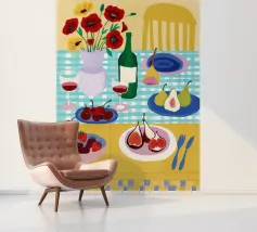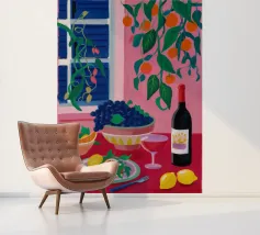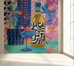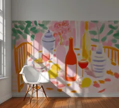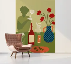 A still life scene on a red tablecloth features wine bottles, glasses, a pitcher, and fruit, with vibrant green and yellow background elements, suggesting a festive and convivial gathering.