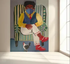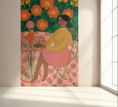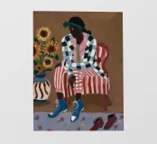 Dit kunstwerk toont een persoon die op een gestreepte stoel zit, omringd door zonnebloemen en een groene tas. De achtergrond is gedempt bruin en creëert een rustieke en reflecterende sfeer.