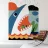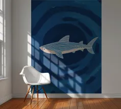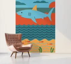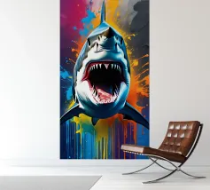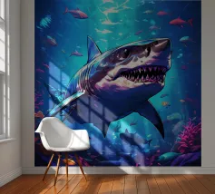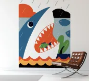 Geniet van een levendige oceaanillustratie met een haai die een vis aanvalt in de zee met regen en wolken op de achtergrond.