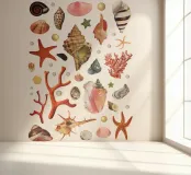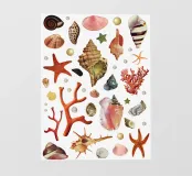 Vintage verzameling van alle soorten schelpen en andere stukjes uit de oceaan, waaronder parels, slakken, koralen, mosselen, oesters, enz. Prachtige nostalgische retro collage.