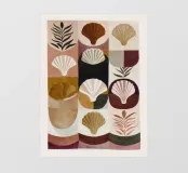 A balanced composition with shells and organic shapes in warm earthy tones. The work shows quiet harmony through color and form.