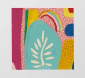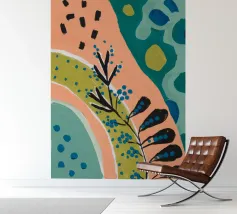 Minimalistische organische vormen spreken zachtjes door gedempte tinten en speelse gelaagdheid.