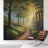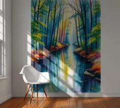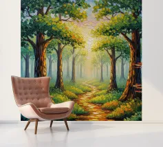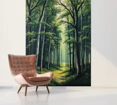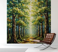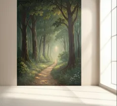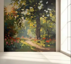 Een schilderachtig en sereen landschapsschilderij met een rustige bosgezicht. Een kronkelend zandpad slingert door een zonovergoten bos en leidt het oog van de kijker naar een schitterende lichtschacht die door het bladerdak breekt. De voorgrond is weelderig begroeid met wilde bloemen in paarse, witte en blauwe tinten, naast levendig groen gebladerte. De torenhoge bomen met hun getextureerde schors creëren een gevoel van diepte en schaal, terwijl het zachte, wazige licht dat door de bladeren filtert een gevoel van vrede en natuurlijke schoonheid oproept. Dit werk combineert realisme met een impressionistische toets,