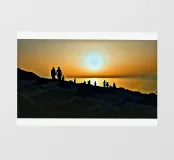 the silhouette of a group of people on the rocky shores admiring the sunset on a summer day.