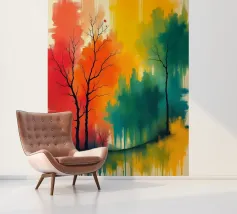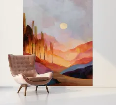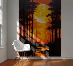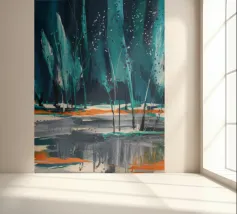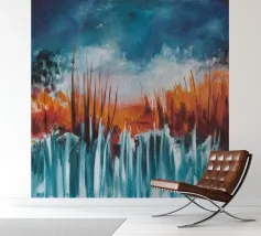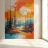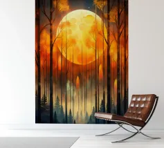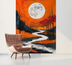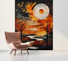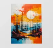 A vibrant and abstract painting capturing the essence of a serene sunset. Bold strokes of orange and blue create a dynamic contrast, while the silhouetted trees and a large, luminous moon add depth and mystery to the scene. This piece is perfect for contemporary spaces seeking a touch of nature and tranquility.