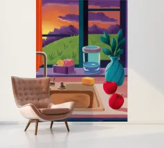 Een rustige scène van twee kopjes thee op een vensterbank, met uitzicht op een prachtige zonsondergang door het raam. De compositie is vredig, romantisch en legt een perfect, rustig moment vast.
