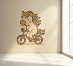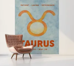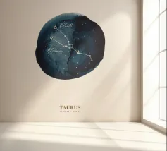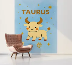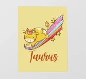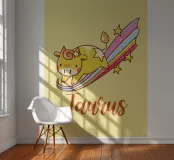 Illustratie van het sterrenbeeld Stier in een schattige en levendige stijl. Deze zachtaardige gouden stier, die langs een regenboogspoor met sterrendetails raast, vertegenwoordigt de kalme maar vastberaden aard van de Stier. Perfect voor wie van astrologie houdt en op zoek is naar een kleurrijk en uniek tintje om zijn of haar ruimte een persoonlijk tintje te geven.