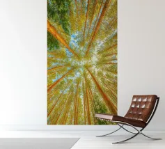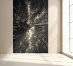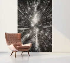 Zwart-wit onderaanzicht van een bos met zeer hoge bomen.