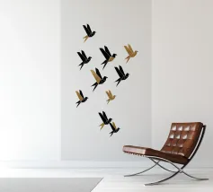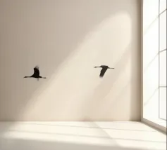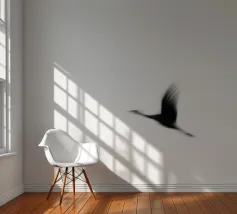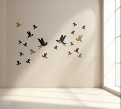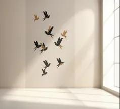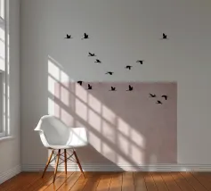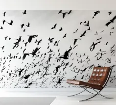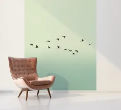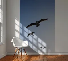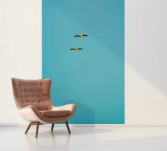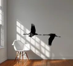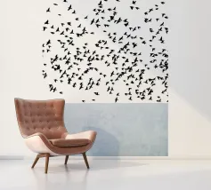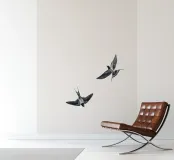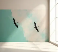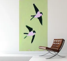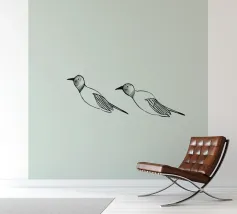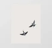 Dit minimalistische ontwerp toont twee zwaluwen die sierlijk door de lucht glijden. De zwart-witte illustratie en de eenvoudige, heldere achtergrond geven het motief een tijdloze en elegante uitstraling. Dit ontwerp is perfect voor liefhebbers van natuurmotieven en minimalistische kunst en brengt rust en lichtheid in elke kamer. Of het nu als muurschildering, kussen of mok is, dit motief is een stijlvol en modern accent voor elk huis en past bij verschillende interieurstijlen.
