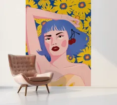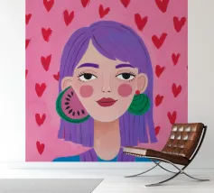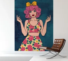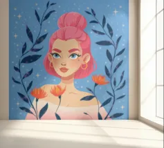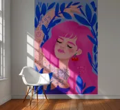 Dit kunstwerk toont een figuur met roze haar tegen een achtergrond vol blauwe en roze bloemen. Het tafereel is levendig en grillig, vol speelse energie.