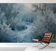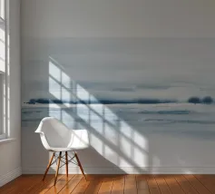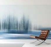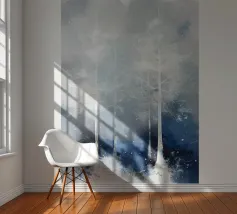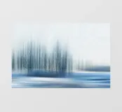 Teder, abstract winterlandschap met kale bomen die vervagen in koele blauwe en witte tinten. De zachte bewegingsonscherpte geeft het motief een rustige, bijna dromerige sfeer en benadrukt de stille schoonheid van de winter.