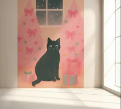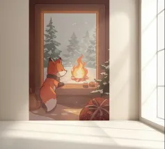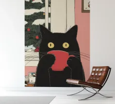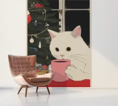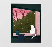 Dit schilderij toont een witte kat die op een vensterbank zit en uitkijkt over een besneeuwd landschap met kale bomen. Het interieur is gezellig, met een kopje en een kledingstuk op de vensterbank, wat warmte en comfort binnen suggereert.