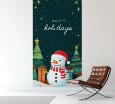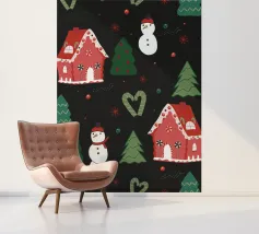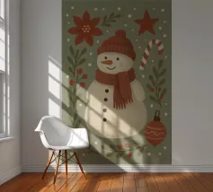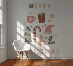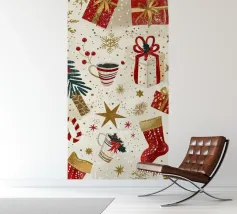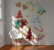 Een speelse, kerstachtige illustratie in aquarelstijl met leuke motieven zoals een sneeuwpop, schaatsen, kopjes warme chocolademelk, zuurstokken, harten van peperkoek en dennenbomen. Gouden sterretjes en sneeuwvlokken liggen losjes verspreid over de lichte achtergrond, waardoor de scène een warme, gezellige winter- en kerstsfeer uitstraalt.