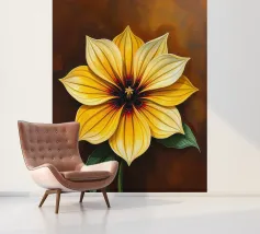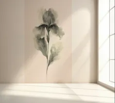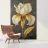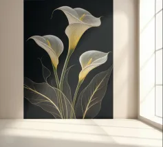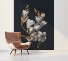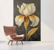 Das Bild zeigt eine realistische und dekorative Darstellung einer Irisblume. Die Blütenblätter sind in sanften Weiß- und Gelbtönen gehalten, mit feinen Linien und Schattierungen, die die natürliche Textur und Tiefe betonen. Der dunkle, strukturierte Hintergrund mit goldenen Akzenten verleiht dem Bild eine edle und luxuriöse Atmosphäre. Insgesamt wirkt es detailreich, elegant und kunstvoll. Ein wahrer Blickfang!