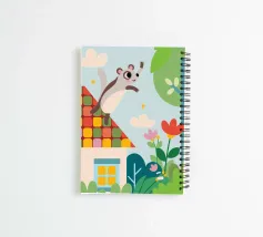 This cute and colorful illustration features a squirrel jumping happily among the trees.