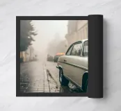 Een gedetailleerd portret van een klassieke auto gedrenkt in de regen, met een gevoel van nostalgie en elegantie. Hoogwaardige fotografie, perfect voor autoliefhebbers, kunstliefhebbers en grafische ontwerpers. De scherpe texturen, kleuren en details springen in het oog.