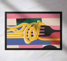 Bold and playful, this pop art graphic illustration features bright yellow spaghetti lifted by chopsticks against a vibrant red background – a quirky celebration of fun, food, and color.