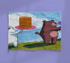 In een grillige tuin houdt een beer een sappige watermeloen vast, omringd door fruit en een weelderige boom. De levendige compositie viert overvloed en de zoetheid van de natuur.