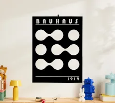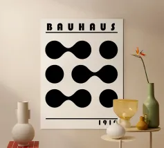 Dit grafisch heldere, abstracte Bauhaus-motief toont een ritmisch driehoek- en vierkantpatroon in krachtig rood op een warme crèmekleurige achtergrond. De strikt geometrische opstelling creëert een spannende balans van dynamiek en orde en doet denken aan klassieke Bauhaus en mid-century designprincipes. Door het bewuste gebruik van contrast en herhaling oogt het patroon tegelijkertijd modern, tijdloos en architectonisch. Het gereduceerde kleurenpalet geeft het ontwerp rust en kracht zonder expressie te verliezen. Ideaal als muurschildering voor woonkamers, designposters, moderne wandkunst.