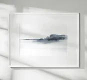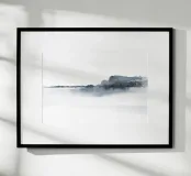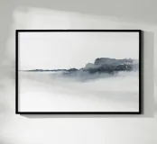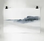Minimalist watercolor landscape in bluish gray tones.