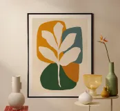 Een minimalistisch abstract ontwerp met een witte bladvorm over kleurrijke geometrische vormen. De achtergrond is zacht beige, wat de eenvoudige elegantie versterkt.