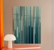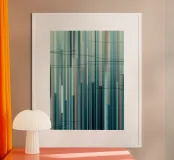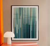 Een moderne abstracte digitale kunstprint met een compositie van verticale lijnen in een rustgevend kleurenpalet van blauw, groen, bruin en gedempt beige. De lijnen variëren in breedte en toon, waardoor een gevoel van diepte en ritme ontstaat, terwijl subtiele, vegende horizontale lijnen een dynamisch contrast toevoegen. Dit meubel roept een gevoel van rust en verfijning op, waardoor het een perfecte aanvulling is voor moderne woonkamers, kantoren of slaapkamers.