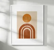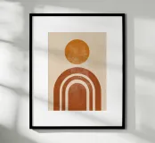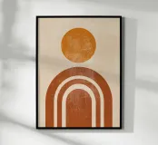 Breng warmte en evenwicht in je ruimte met dit abstracte geometrische kunstwerk met een zon- en boogontwerp in aardetinten. De minimalistische retro-esthetiek voegt een tijdloze, rustgevende touch toe aan elk interieur. Perfect voor een moderne, bohemien of Scandinavisch geïnspireerde inrichting.