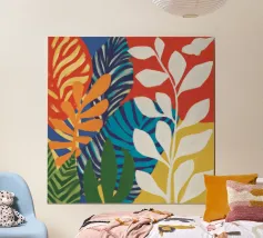 Een stilleven van citroenen in een blauwe kom die rusten op een rijk paars doek. Daarachter staat een hoge gele vaas met witte takken tegen een vurig oranje achtergrond, waardoor een contrastrijk, kleurrijk tafereel ontstaat.