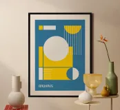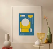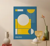 Een serene maar dynamische abstracte poster in Bauhaus-stijl, gedomineerd door een diepblauwe achtergrond. De compositie bestaat uit gedurfde geometrische vormen in helder geel en zuiver wit, waaronder een grote centrale cirkel, rechthoeken en halve cirkels. Het gebruik van fijne witte verticale lijnen over een halve cirkel en horizontale lijnen over een rechthoek voegt textuur en beweging toe en weerspiegelt constructivistische principes. Dit werk biedt een verfijnde, moderne esthetiek. De digitale poster wordt geleverd in superieure 7000x5000 pixels met een resolutie van 300 dpi, zodat je verzekerd bent van de hoogste afdrukkwaliteit en kleurechtheid voor je decor.