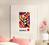 Een intens levendige en complexe abstracte poster in de geest van de Bauhaus-beweging, met een rijk tapijt van geometrische vormen zoals cirkels, kwartcirkels, driehoeken en vierkanten. De dynamische compositie gebruikt een gedurfd, uitgebreid palet van rood, geel, zwart, wit en opvallend paars. Het ontwerp is opgedeeld in visueel dichte blokken met dambordpatronen, strepen en effen vormen, die een hoog contrast en energie creëren. Het woord "BAUHAUS" en een rode cirkel staan onderaan. Deze eersteklas digitale kunst (7000x5000 pixels, 300 dpi) biedt uitzonderlijke helderheid en kleur voor een krachtige uitstraling.