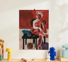 Dit kunstwerk toont een dynamisch abstract personage met gedurfde lijnen en een mix van rode, blauwe en witte kleuren. De achtergrond is gevuld met abstracte vormen en patronen, wat bijdraagt aan het algehele dynamische thema.