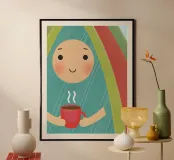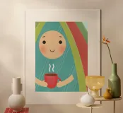 Een rustgevende illustratie van een persoon met een vriendelijke glimlach die een warme kop koffie vasthoudt.