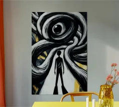 Een intens moment van bevrijding of waanzin - dit expressieve kunstwerk toont een gezicht dat explodeert van energie, emotie en chaos. De dynamische, levendige kleurstreken die uit het hoofd barsten symboliseren een creatieve explosie, pijn of verlichting. De dramatische uitdrukking en gedurfde schilderstijl vangen de blik van de kijker en nodigen uit tot interpretatie. Een indrukwekkend stuk voor liefhebbers van moderne, abstracte kunst.