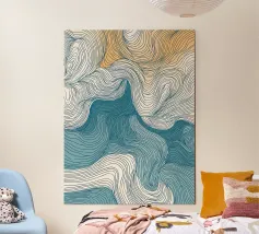 Een gedurfd abstract patroon met een vleugje dynamische energie dat beweging en vloeibaarheid symboliseert. Heldere kleuren die thema's als water, leven en beweging oproepen. Een innovatieve fusie van traditie en moderniteit voor eigentijdse, minimalistische interieurs. Een unieke visuele taal die culturele grenzen overstijgt.