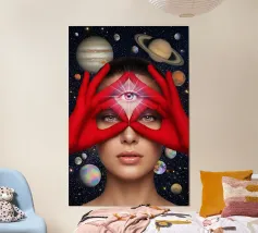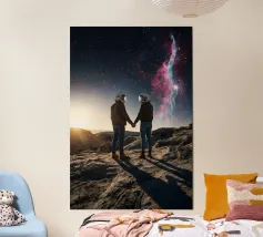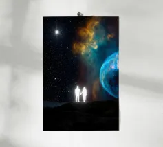 Dit surrealistische kunstwerk toont twee geklede figuren die hand in hand door een oude stenen boog lopen in de richting van een gloeiende hemel met roze en violette tinten. Boven hen zweeft een stralend geometrisch oog dat symbool staat voor bewustzijn, mysterie en dieper begrip. De mix van historische architectuur, zachte zonsondergangkleuren en symbolische iconografie creëert een scène vol betekenis en verbeelding. Ideaal voor fans van spirituele kunst, surrealistische verhalen en tot nadenken stemmende wanddecoratie die aanzet tot nieuwsgierigheid en reflectie.